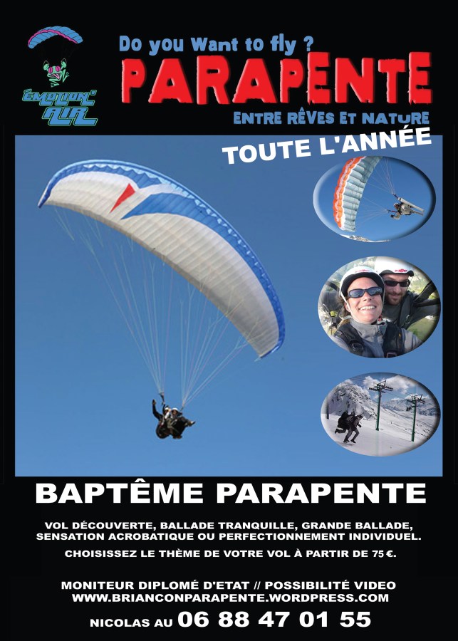 Emotion’Air Ecole de parapente et de speed riding à Briançon Serre Chevalier ! baptême bi place et leçons.